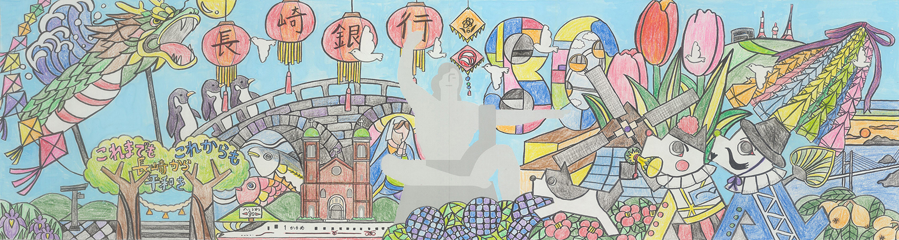 長崎の四季を彩る祭りや観光名所、豊かな自然と特産品などの風物を、バランスのよい色使いで調和させています。多様な文化を受け入れ、重層的な歴史を紡ぎ、平和を希求してきたこの街を的確に表現した作品だと感じました。特に、当行の本店がある栄町の奉納踊り「阿蘭陀万歳」に扮するワンクの姿は、印象に残りました。