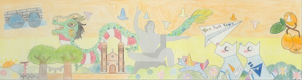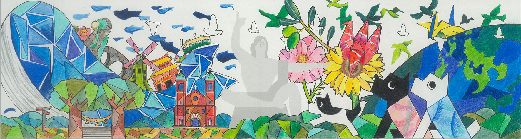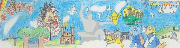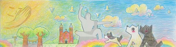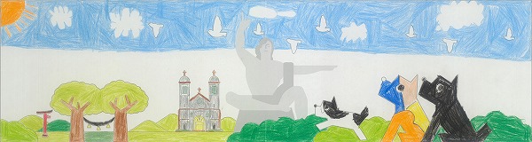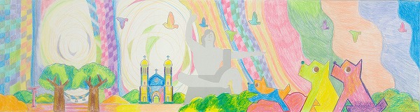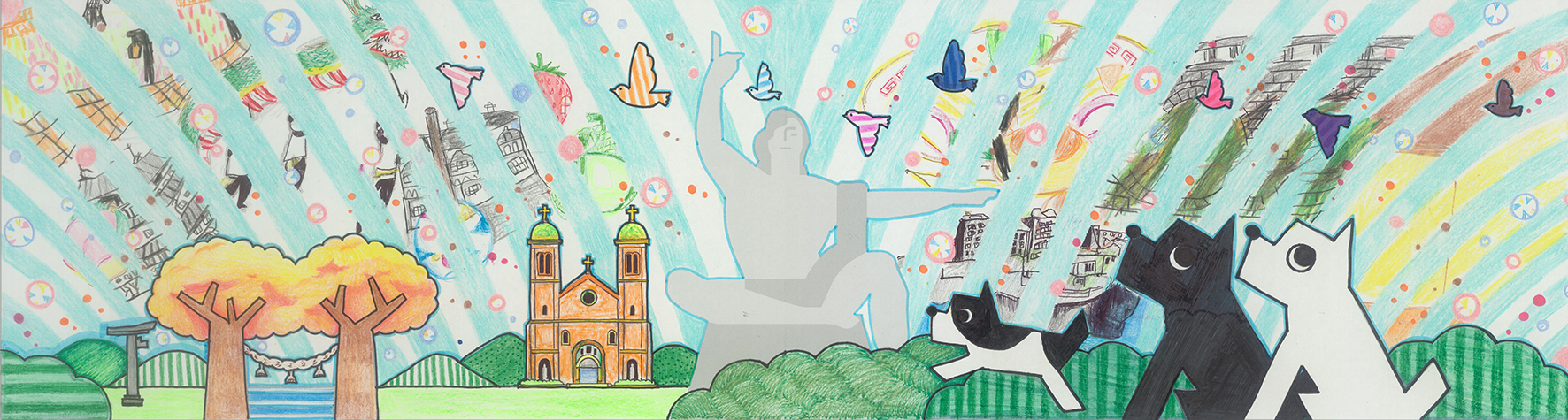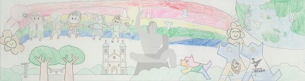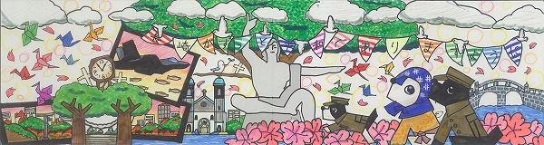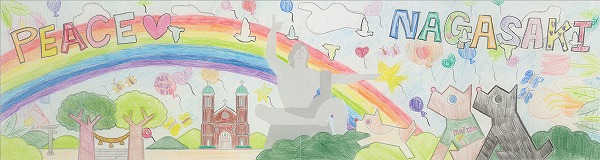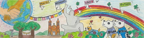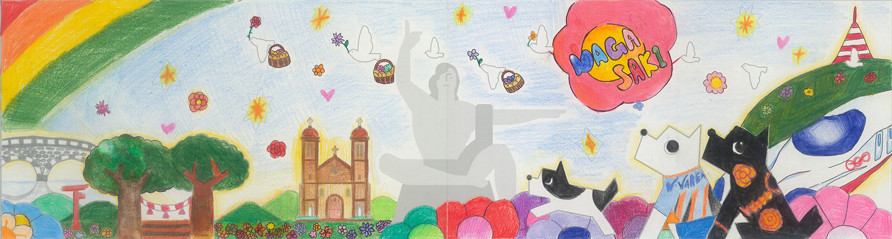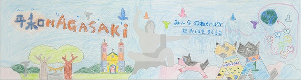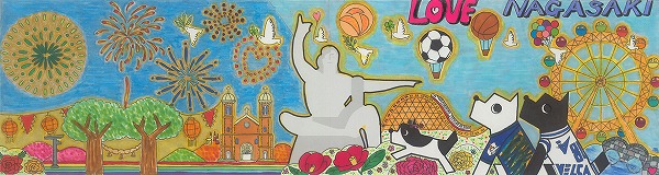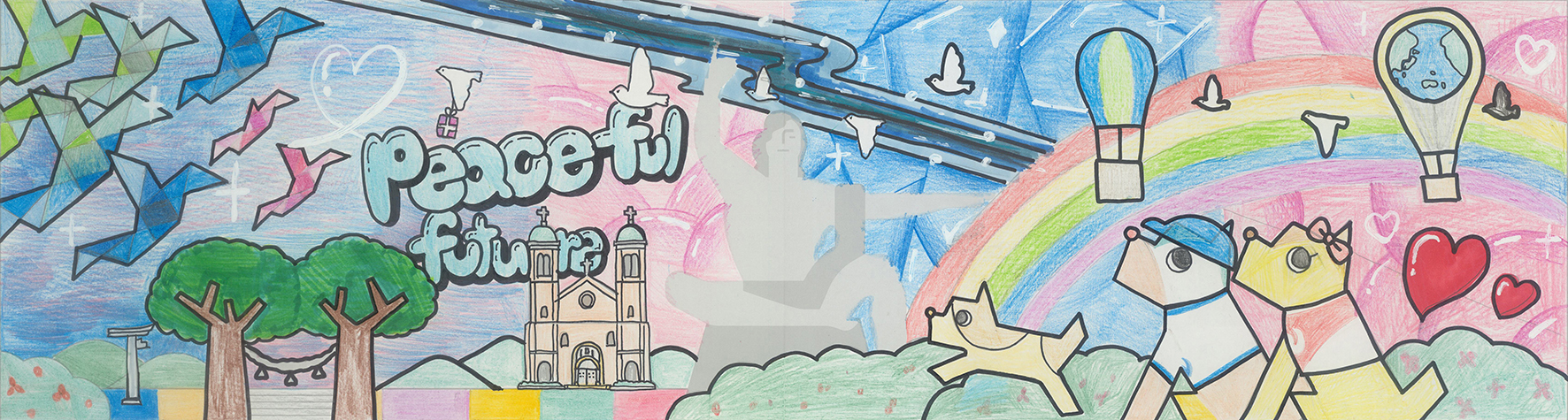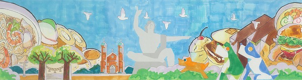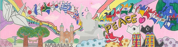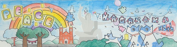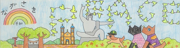 中央の平和祈念像の背景に、長崎の青い空と夢や希望がダイナミックに広がっている表現がいいですね。オリジナリティのある構成で、枠を飛び出すほどのエネルギーが、平和への純粋な願いとして画面全体から溢れ出しています。