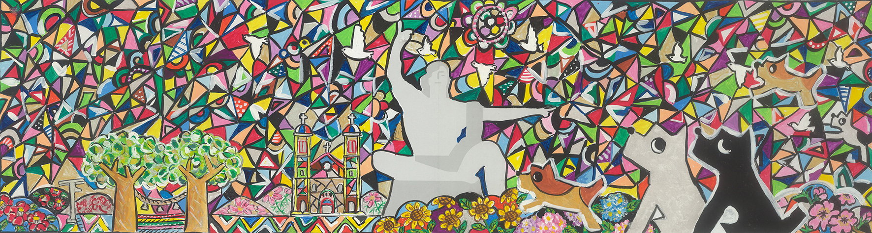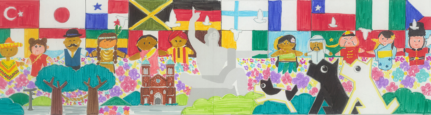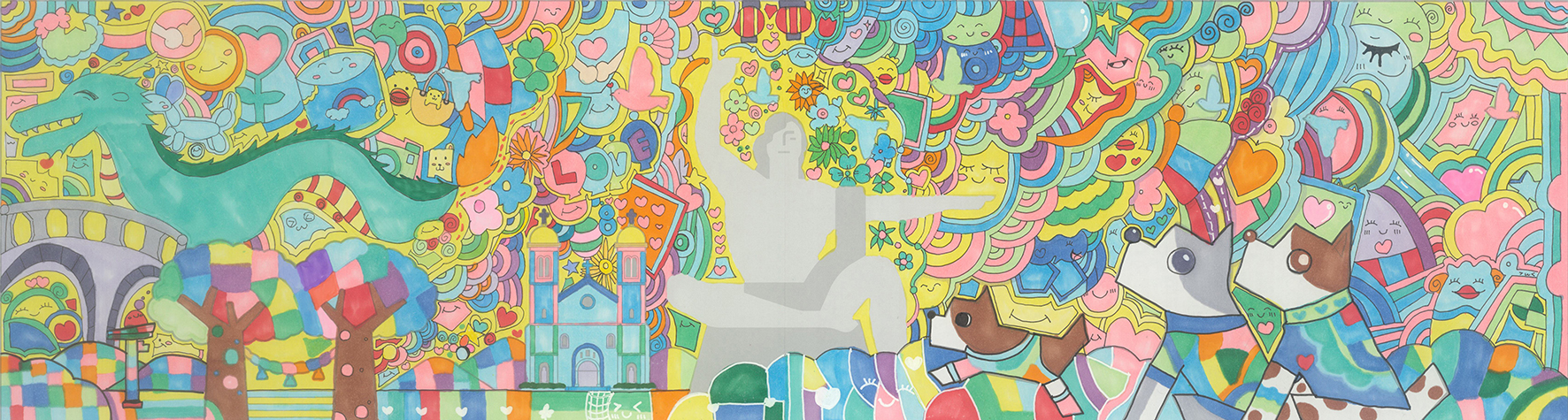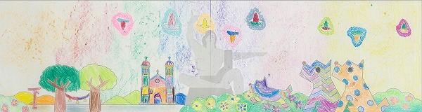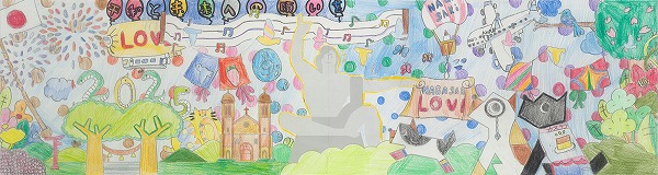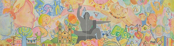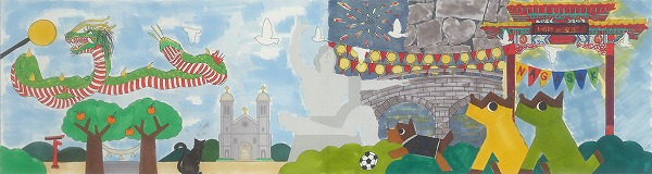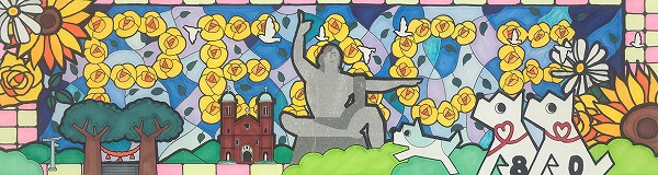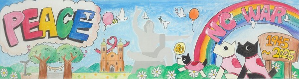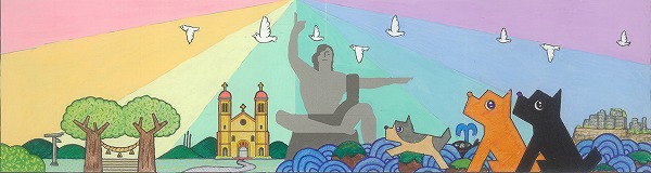 カラフルな色使いの中に本当にたくさんの笑顔が溢れんばかりに描かれています。笑顔のメッセージで平和祈念像も微笑んでいるように見える一枚ですね。