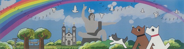長崎を代表する魚、橋、お寺などがダイナミックに描かれています。折り鶴や背景の草木もステンドグラス風に表現されておりワンクも長崎を満喫しているようです。