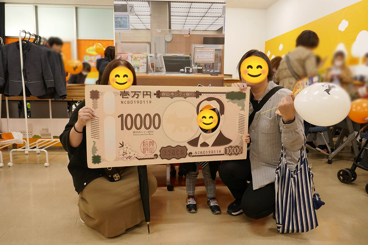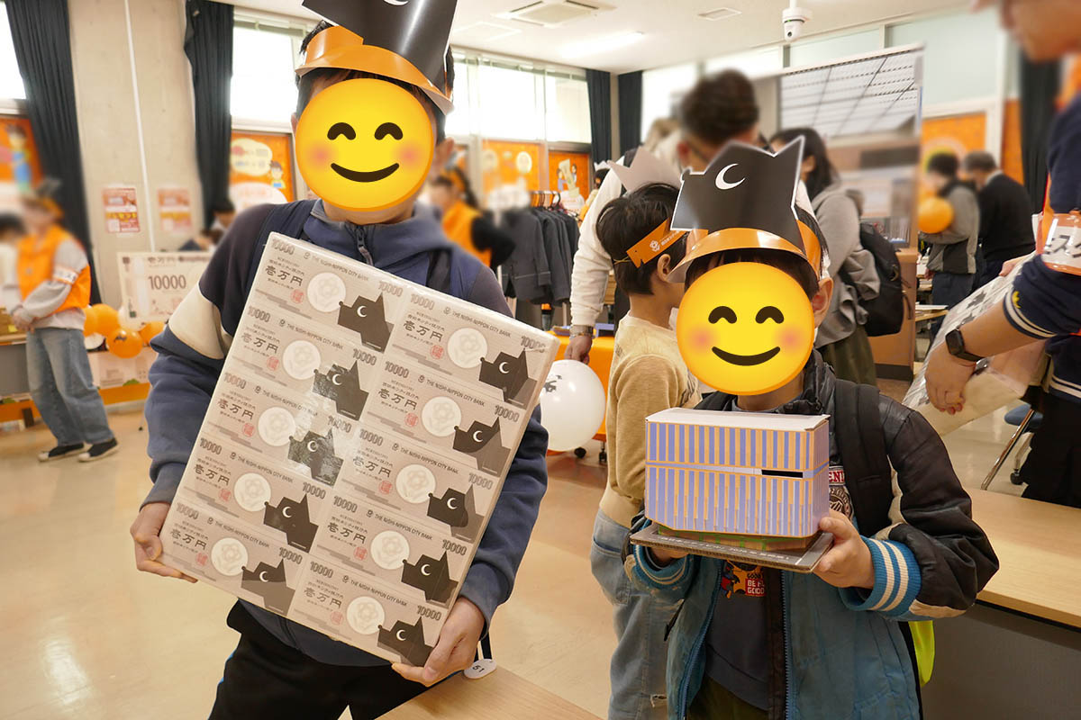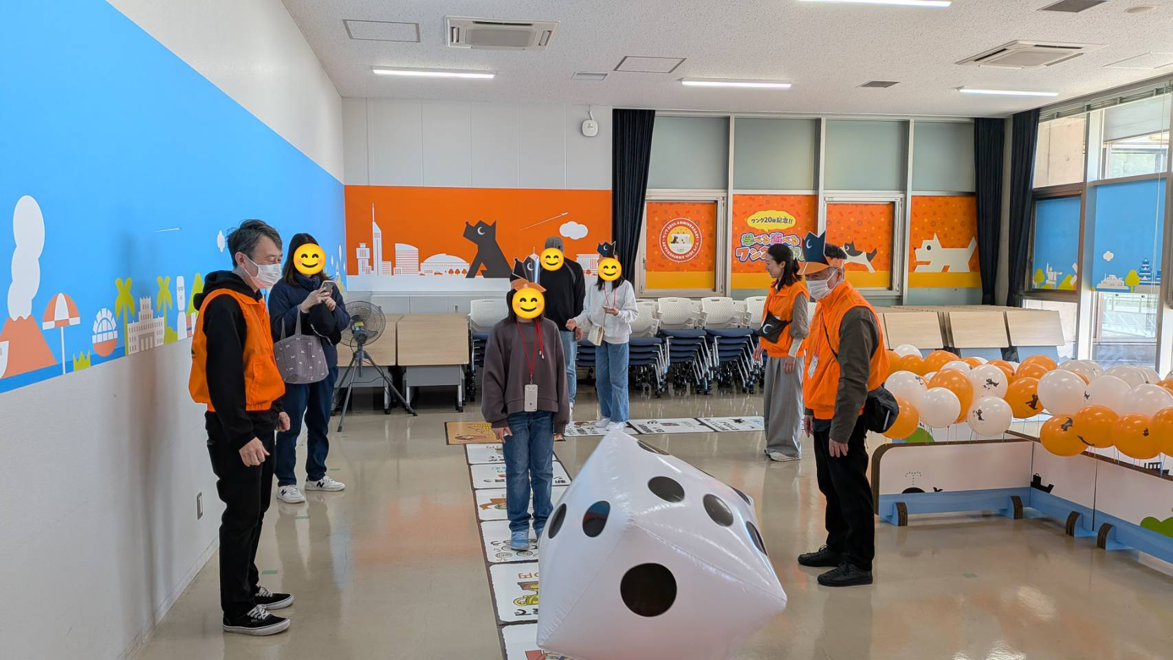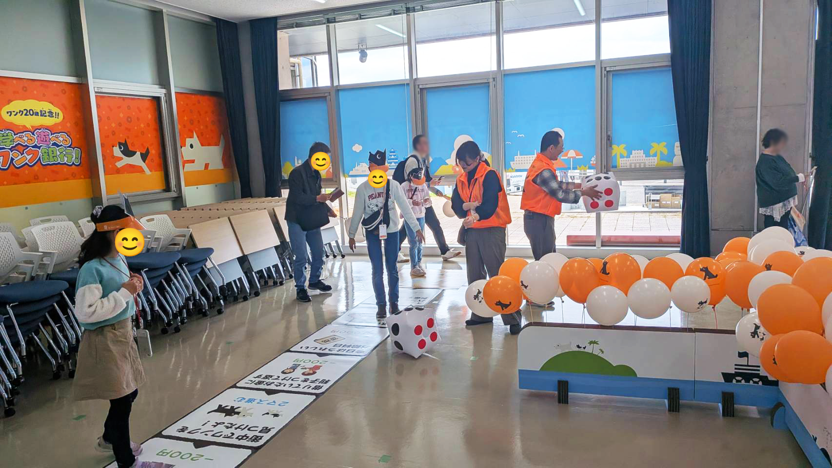 巨大なすごろくゲームでは、巨大なサイコロを転がし、止まったマスでお金の出入金を模擬体験して、お金のことを楽しく学び、最後にはワンクグッズなどをプレゼントしました。