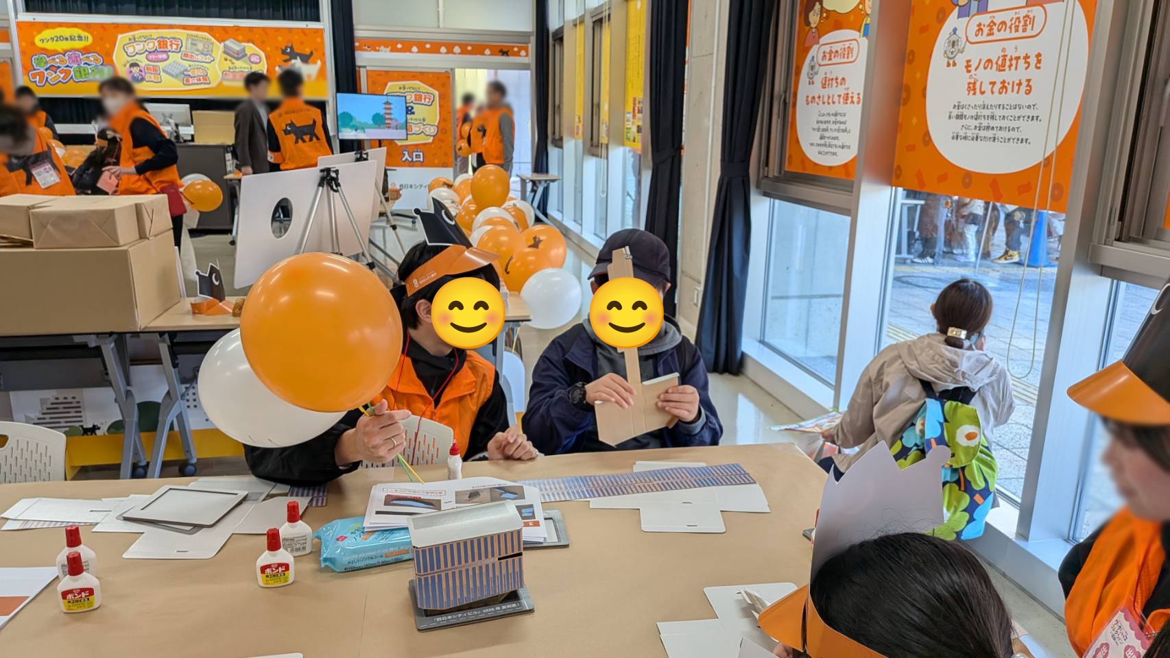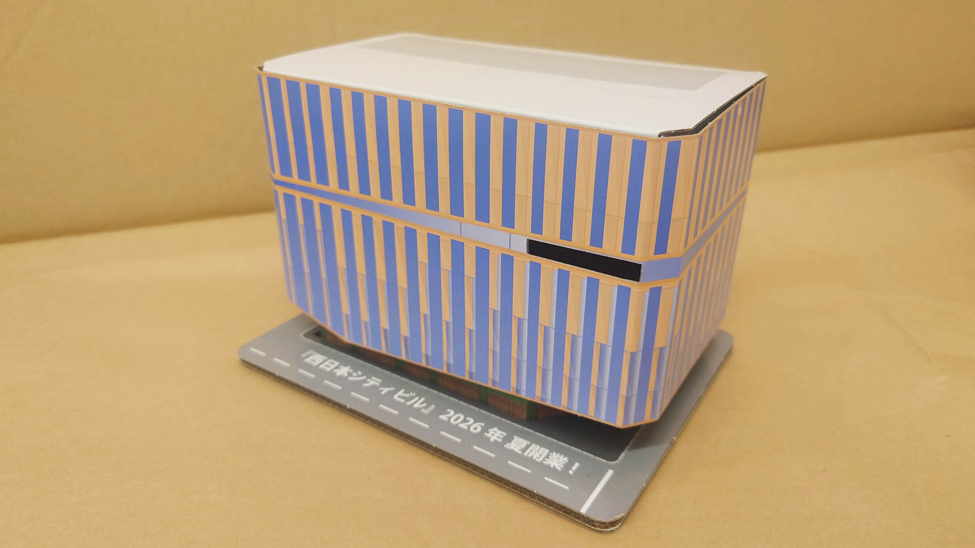博多駅前に2026年夏に開業する西日本シティビルを模型にした段ボール貯金箱を制作。作った貯金箱は皆さんにお持ち帰りいただきました。